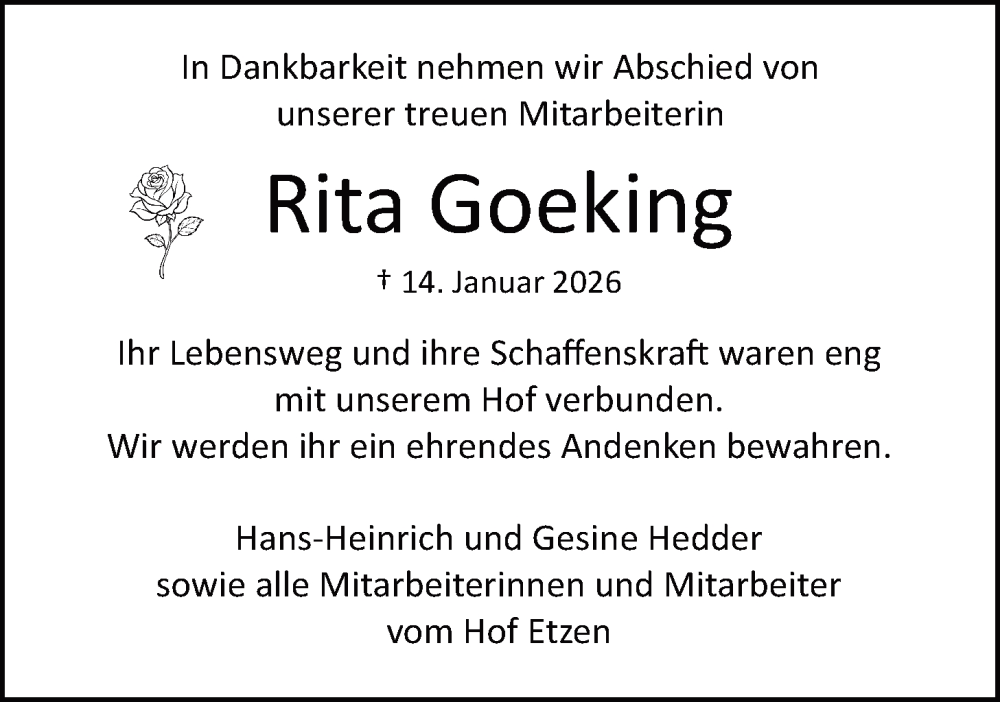 Hier finden Sie alle Traueranzeigen aus der Zeitung, die bisher für Rita Goeking erschienen sind. Weitere Traueranzeigen, die in der Zeitung erscheinen, werden hier ebenfalls aufgelistet